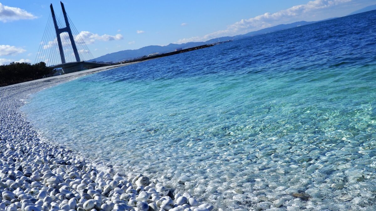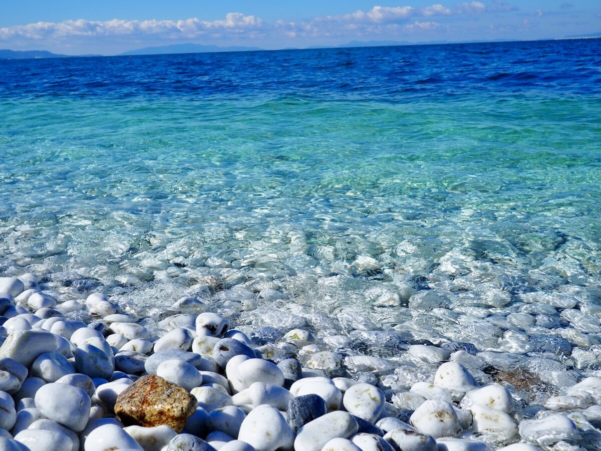 手前までは白い石が青色が濃くなっている所からゴロタという感じ